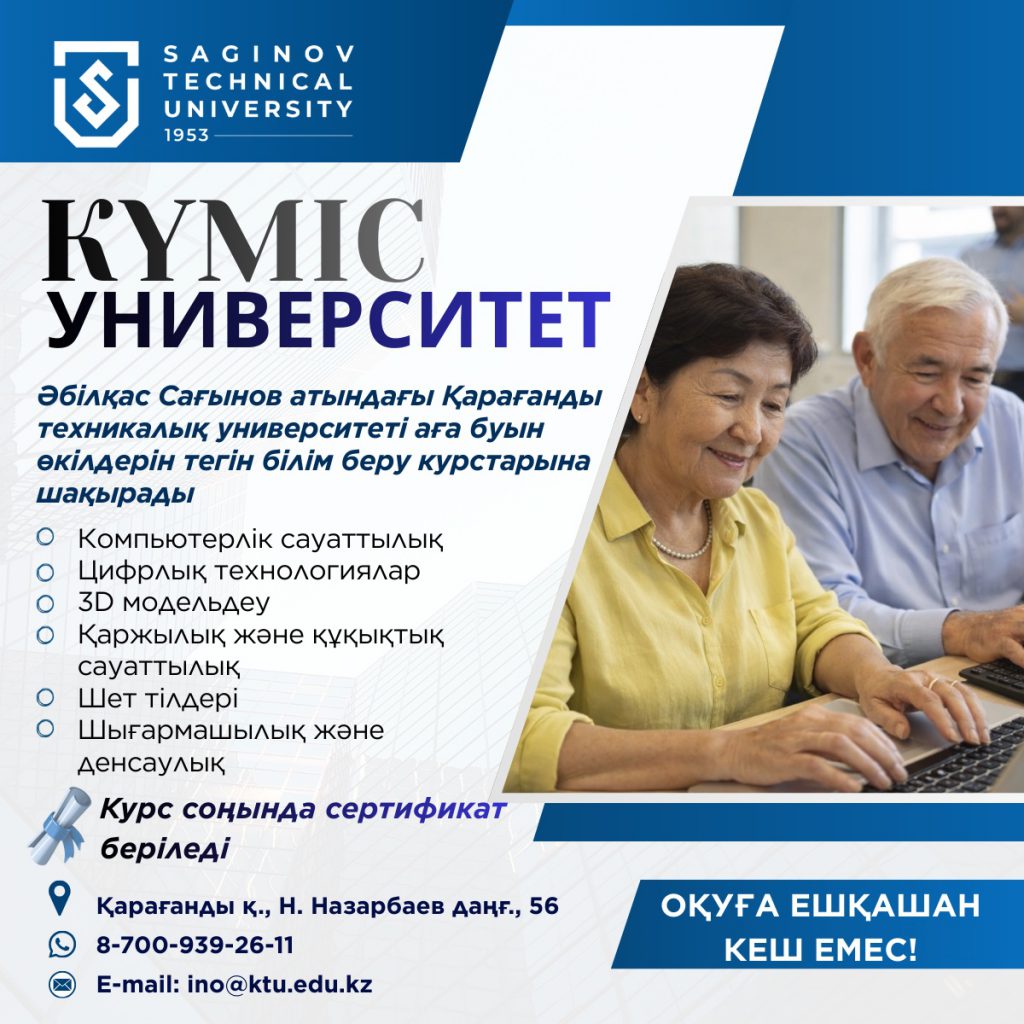 Бағдарламалар заманауи технологияларды игеруге, денсаулықты жақсартуға, шығармашылықты дамытуға және қарым-қатынас аясын кеңейтуге көмектеседі. Оқыту белсенді ұзақ өмір сүруге ықпал етеді, цифрлық технологияларды қолдануға деген сенімділікті арттырады және өзін-өзі дамытуға жаңа мүмкіндіктер ашады. Оқыту бағыттары: Курстар мына бағыттар бойынша өткізіледі: — Әрі қарай оқу …