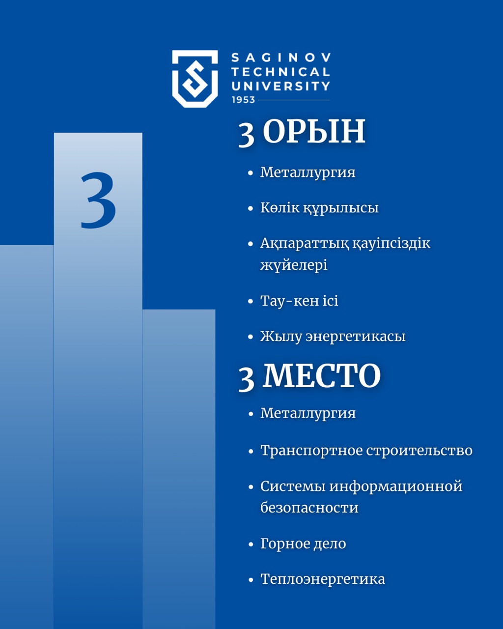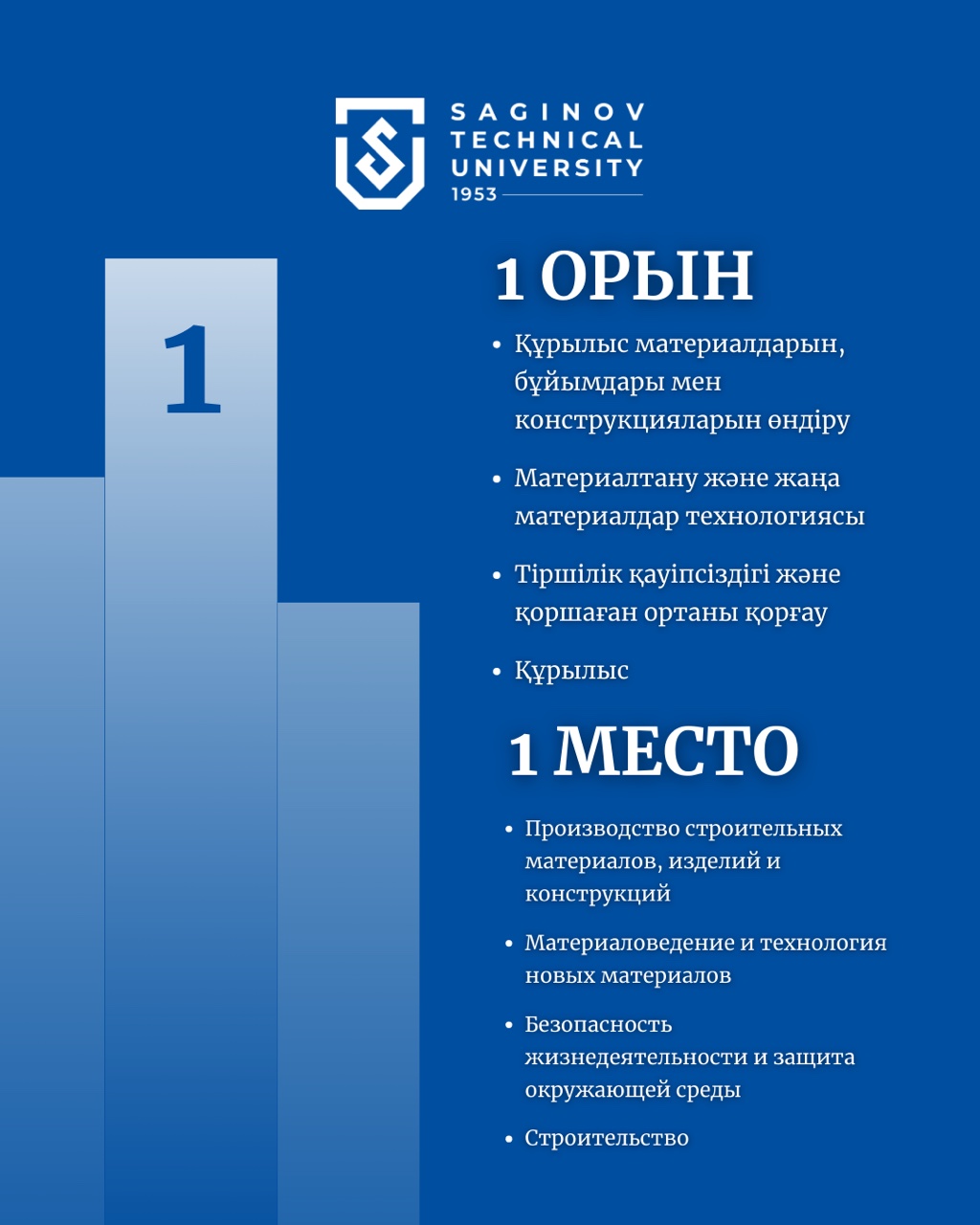Бірінші орынды «Құрылыс материалдарын, бұйымдары мен конструкцияларын өндіру», «Материалтану және жаңа материалдар технологиясы», «Тіршілік қауіпсіздігі және қоршаған ортаны қорғау», «Құрылыс» білім беру бағдарламалары иелене отырып, өзектілігімен қатар еңбек нарығында жоғары сұранысқа ие екенін айқын көрсетті. 2024 жылғы деректермен салыстырғанда бірінші орын алған бағдарламалардың саны екі есе артты. Бұл университеттің жетекші білім беру бағдарламаларының бәсекеге қабілеттілігінің және ұлттық деңгейде танылуының өскенін көрсетеді. Сондай-ақ аталған нәтиже сапалы оқытуға, инновациялық әдістемелерді енгізуге және еңбек нарығы талаптарына бейімделген білім беру бағдарламаларын дамытуға бағытталған  тұрақты жұмысын айқындайды.