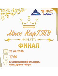 Дорогие студенты! Приглашаем Вас на финал конкурса «Мисс КарГТУ — 2016», который состоится 21 апреля в 17:30 ч. в русском драматическом театре им. К. Станиславского. Билеты можно приобрести у председателей профбюро факультетов: АСФ — Қалқаманов Айбат ГФ — Кожабек Науан Читать далее …