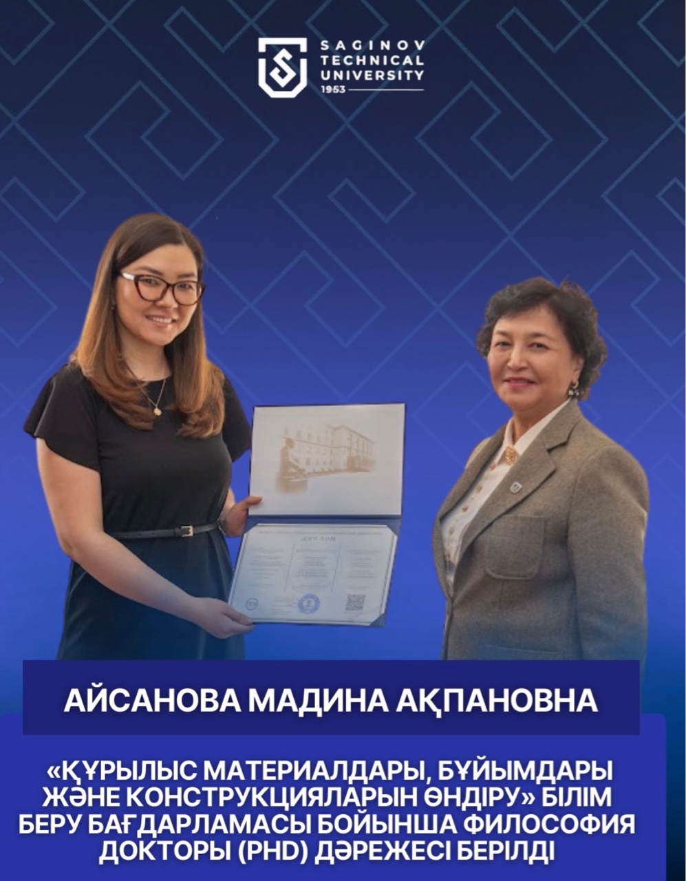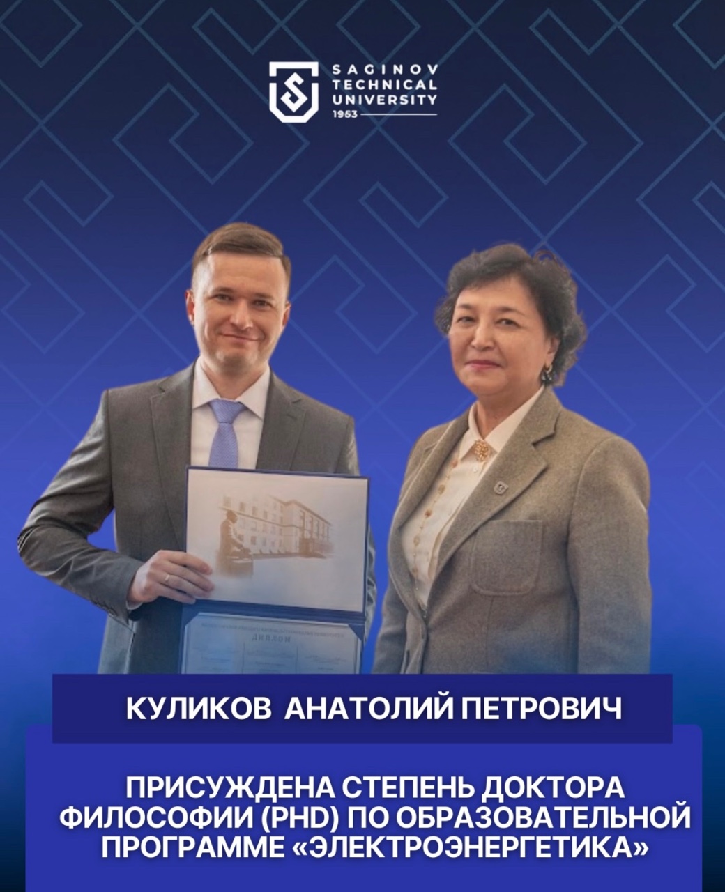 Қазақстан Республикасының Ғылым және жоғары білім саласында сапаны қамтамасыз ету комитеті төрағасының бұйрығына сәйкес,«Электроэнергетика» білім беру бағдарламасы бойынша Анатолий Куликов және «Құрылыс материалдары, бұйымдары және конструкцияларын өндіру» білім беру бағдарламасы бойынша Максим Хан мен Мадина Айсановаға философия докторы (PhD) ғылыми дәрежесі берілді.