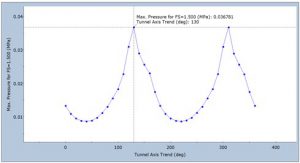 На рисунке 3 представлена зависимость максимального давления крепи (для достижения коэффициента запаса FS = 1.5) от азимута направления оси выработки (Tunnel Axis Trend). График демонстрирует влияние ориентации выработки относительно систем трещин на требуемое давление крепи. Видно, что при определённых направлениях оси выработки (около 130° и 310°) требуется максимальное давление (до 0.037 МПа) для обеспечения устойчивости, что связано с формированием наиболее неустойчивых клиньев. Данные результаты позволяют оптимизировать направление проходки и схему крепления для минимизации рисков обрушения.