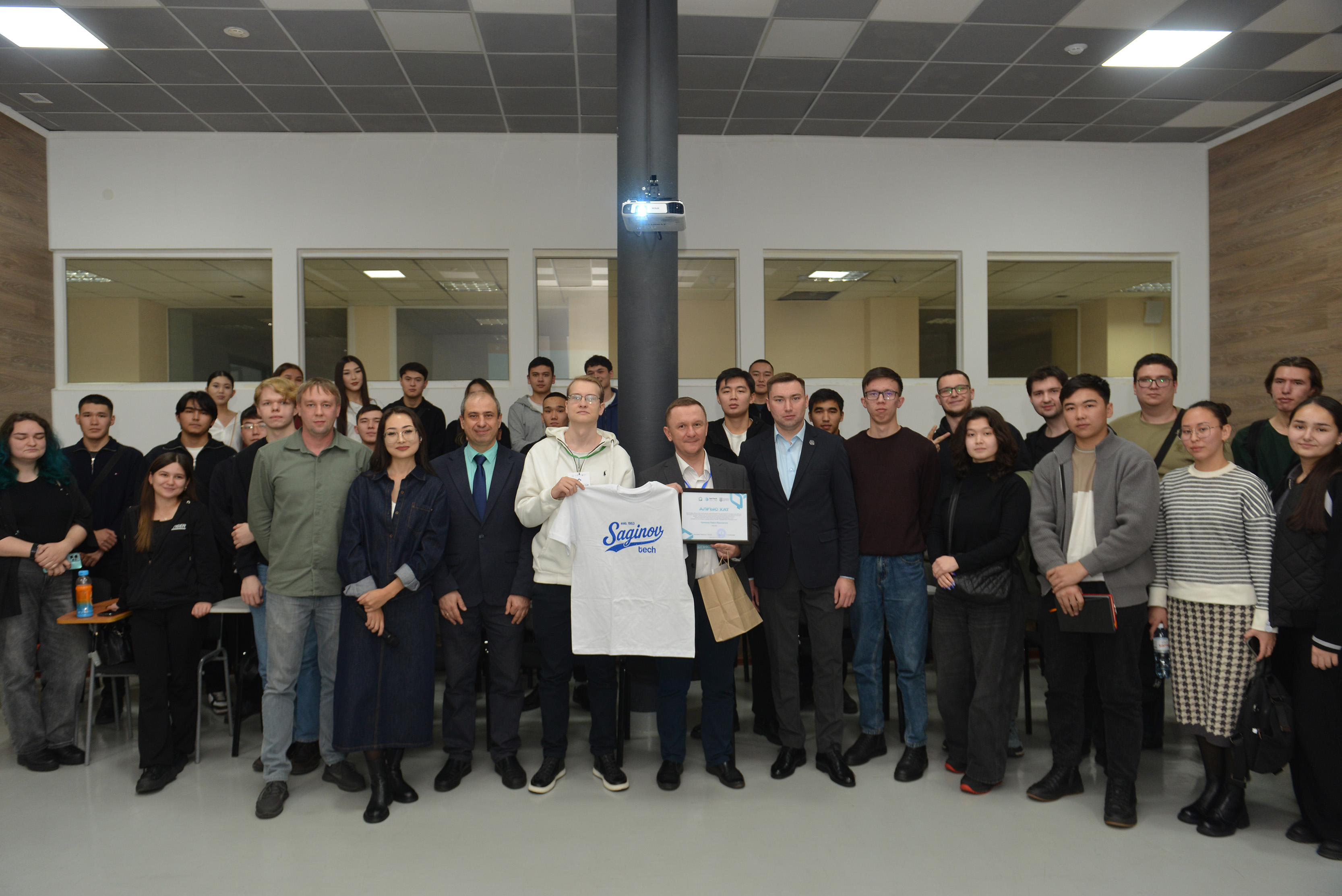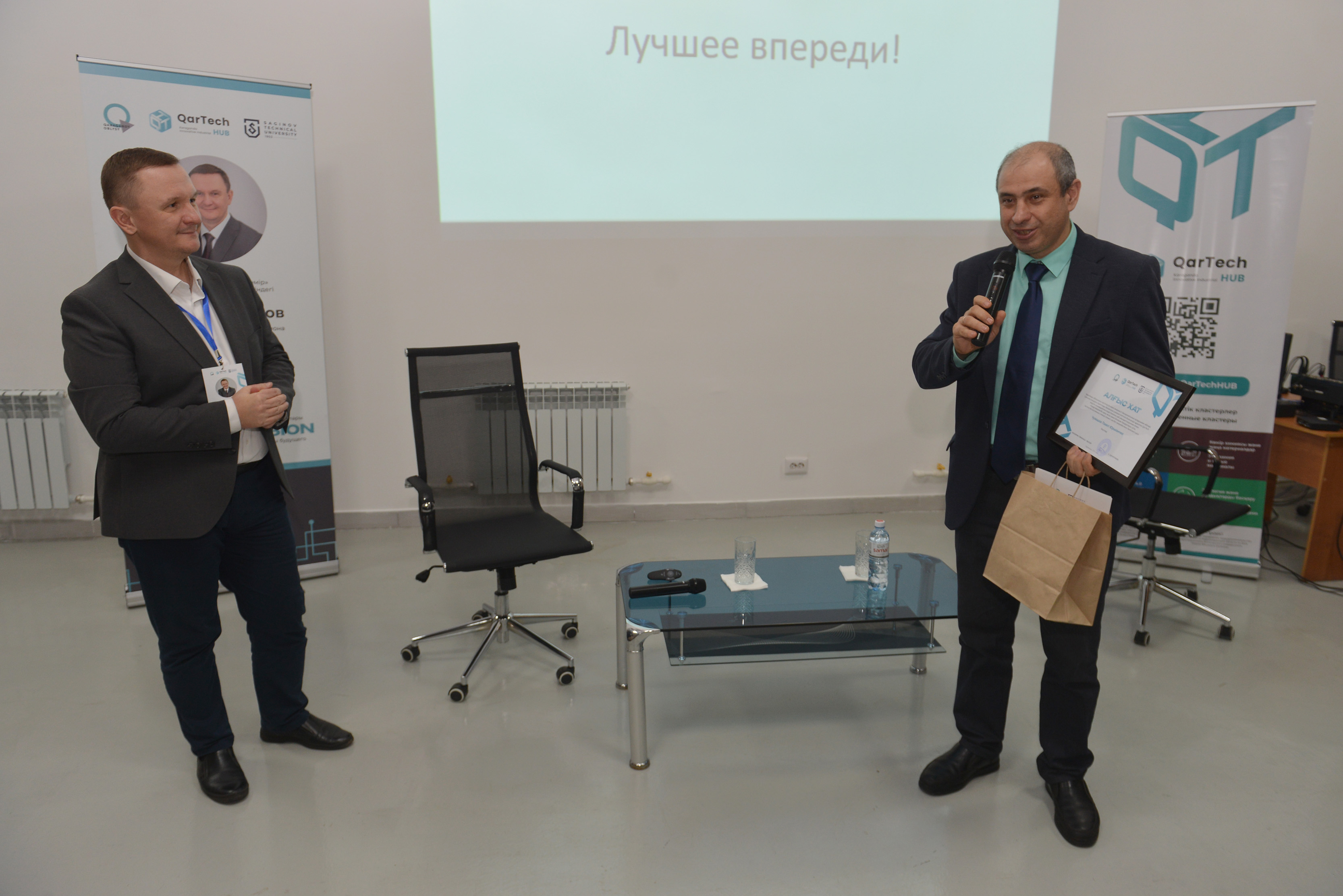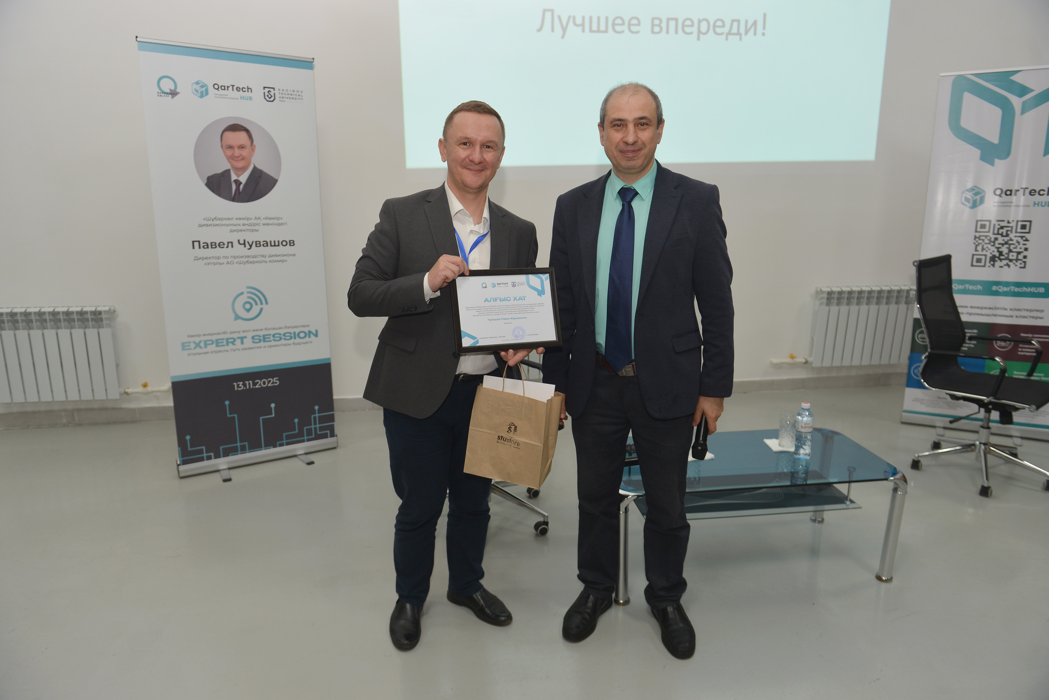 Кездесу соңында Павел Юрьевичке QarTech қауымдастығының дамуына қосқан үлесі үшін Алғыс хат пен сыйлыққа STU мерчі табысталды.