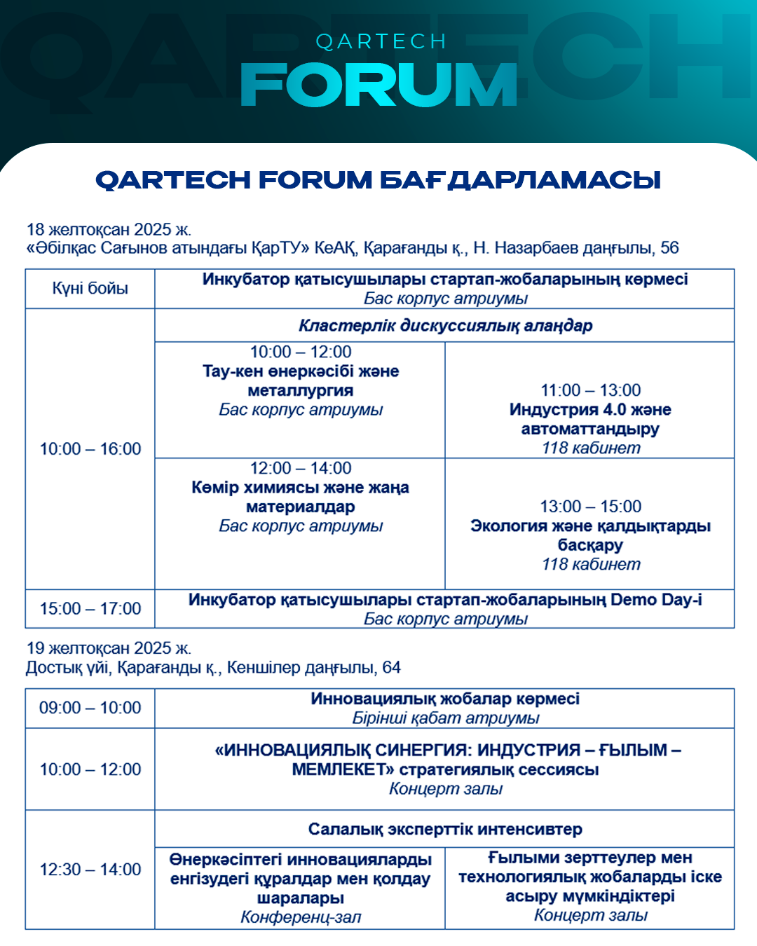 2025 жылдың 18–19 желтоқсанында Қарағанды облысында Облыстың кәсіпкерлік және өнеркәсіп басқармасының қолдауымен Saginov Technical University ұйымдастыратын QarTech Өңірлік инновациялық-индустриялық форумы өтеді.