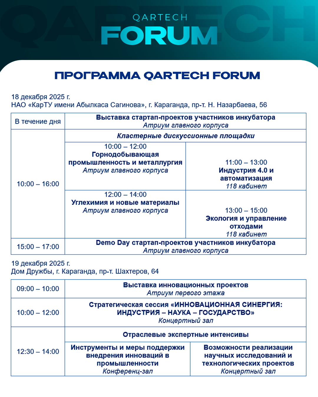 18–19 декабря 2025 года в Карагандинской области состоится Региональный инновационно-индустриальный форум QarTech, организуемый Saginov Technical University при поддержке Управления предпринимательства и промышленности Карагандинской области.