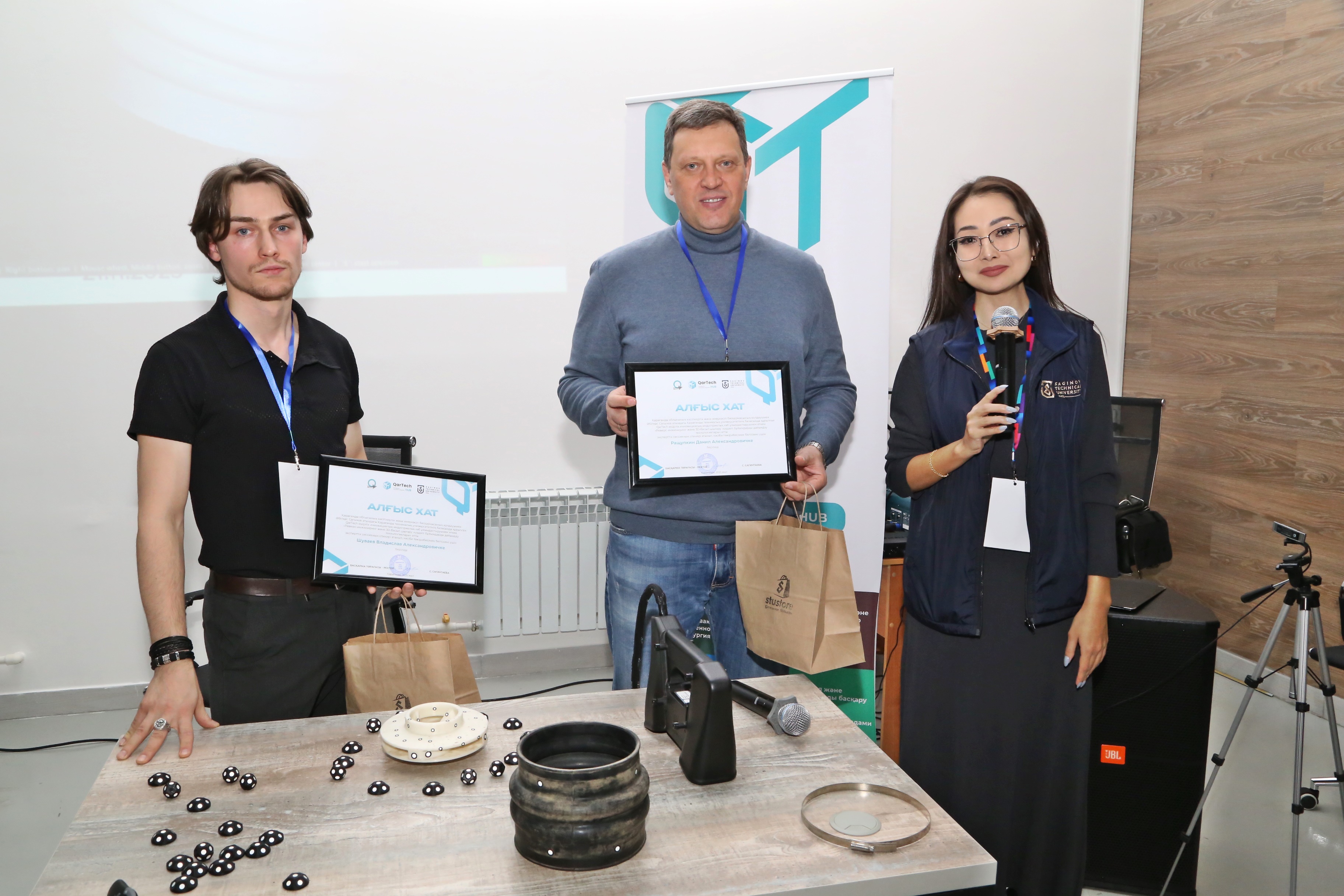 Кездесу соңында спикерлерге QarTech қауымдастығының дамуына қосқан үлесі үшін алғыс хаттар мен STU мерчі сыйға тартылды.