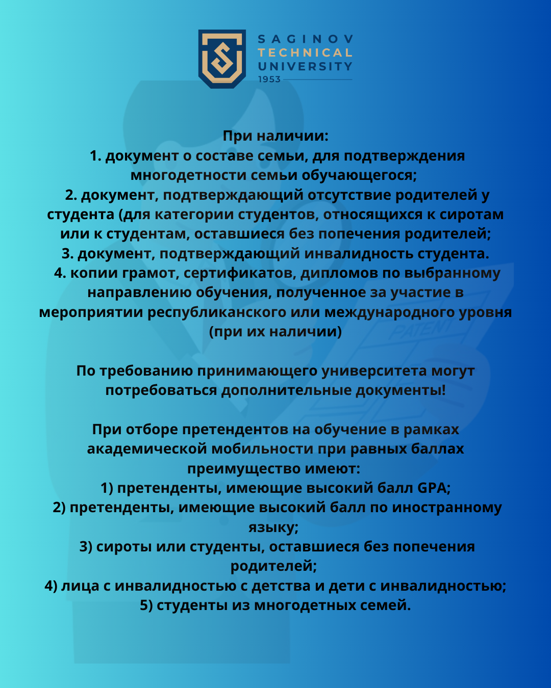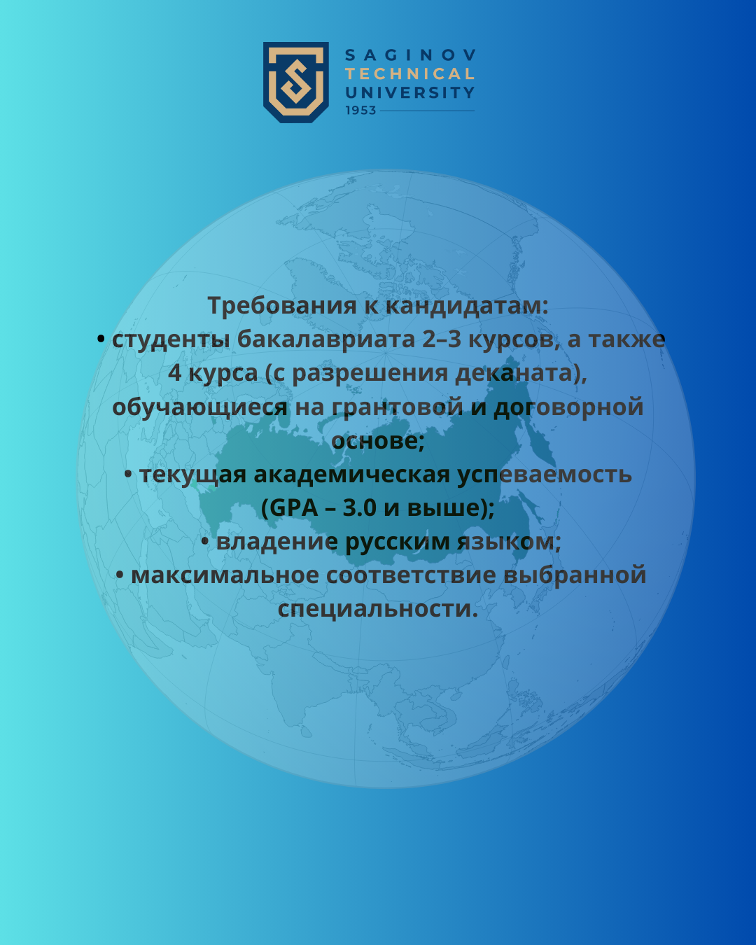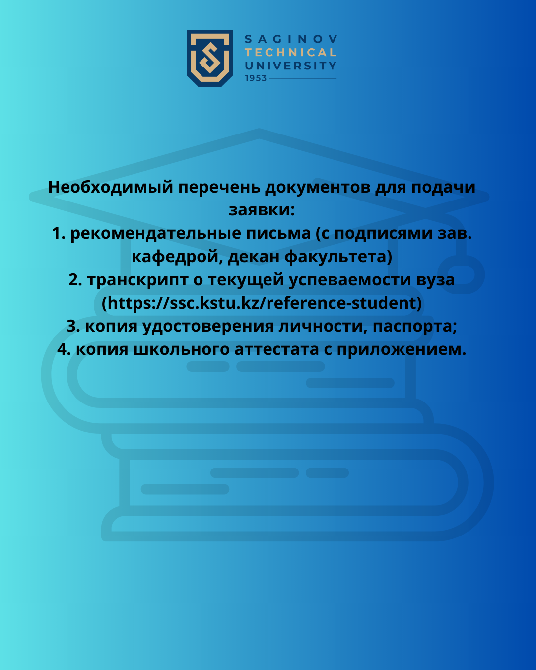 Құжаттар 2026 жылғы 10 сәуірге дейін университеттің бас ғимараты, 241-кабинетте қабылданады.
