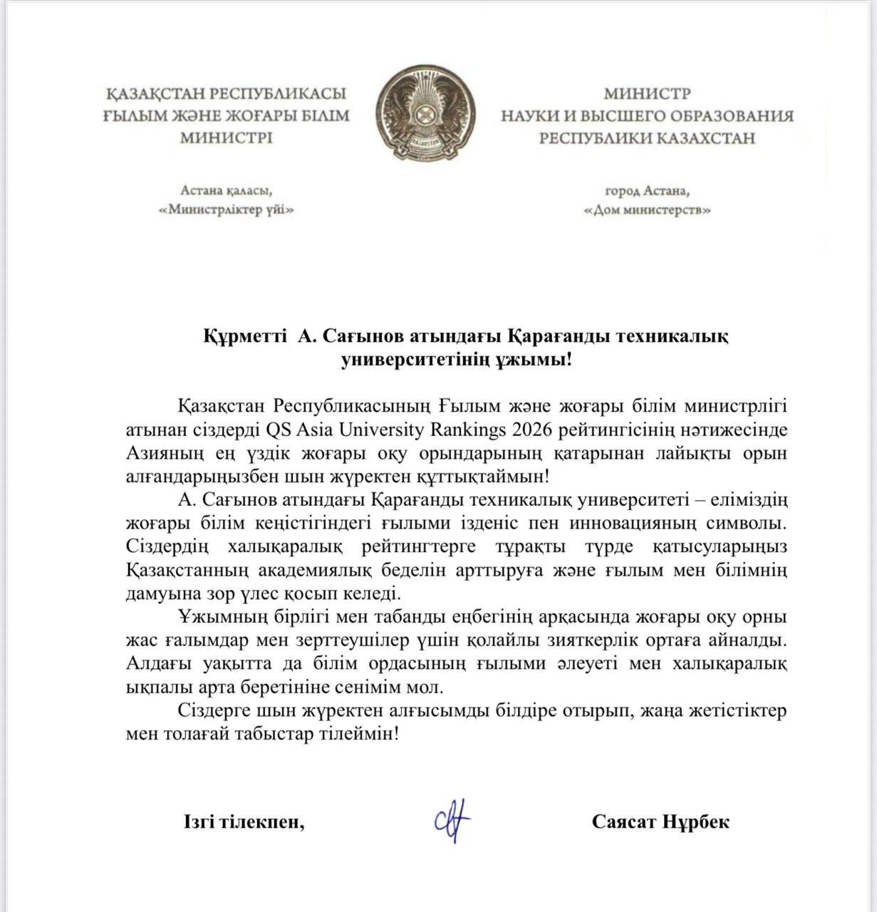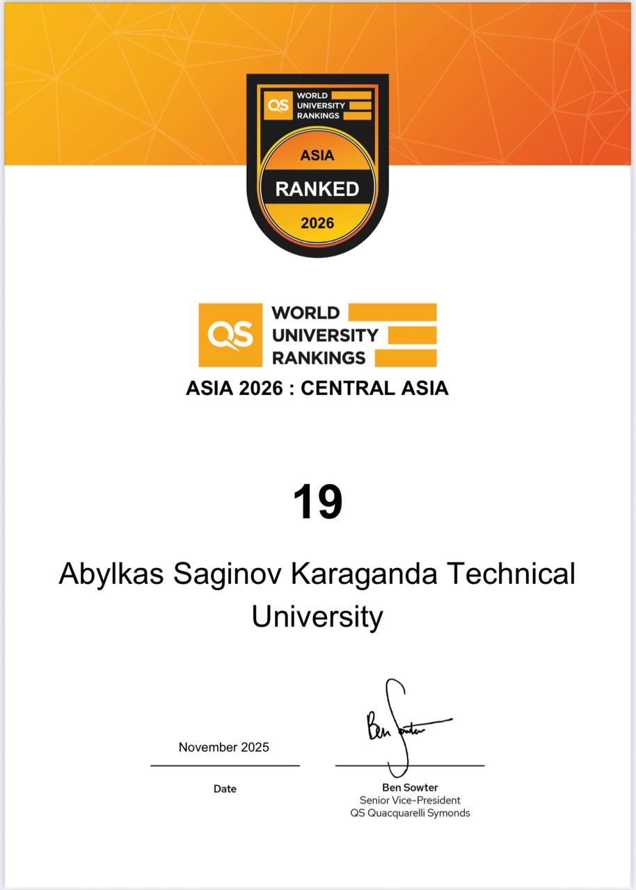 QS Asia University Rankings халықаралық рейтингінде қазақстандық жоғары оқу орындарының жетістіктері Республикамыздың зияткерлік әлеуетінің өсуінің жарқын көрінісі болып табылады. Осыған сәйкес, Орталық Азиядағы үздік 20 университеттің ішінде Әбілқас Сағынов атындағы Қарағанды техникалық университеті де аталып өткен. Ал Азиядағы 1500-ден астам университеттердің ішінде біздің университет әлемдік деңгейде бәсекеге қабілеттілігін растай отырып, 303-ші орынға ие болды.