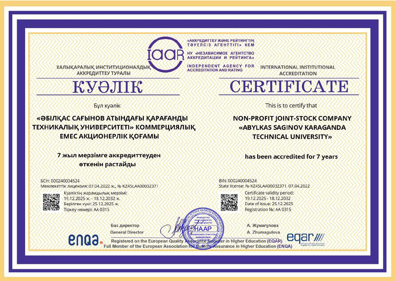 - Әбілқас Сағынов атындағы ҚарТУ – 2025 жылдың желтоқсаны 2032 жылдың желтоқсаны