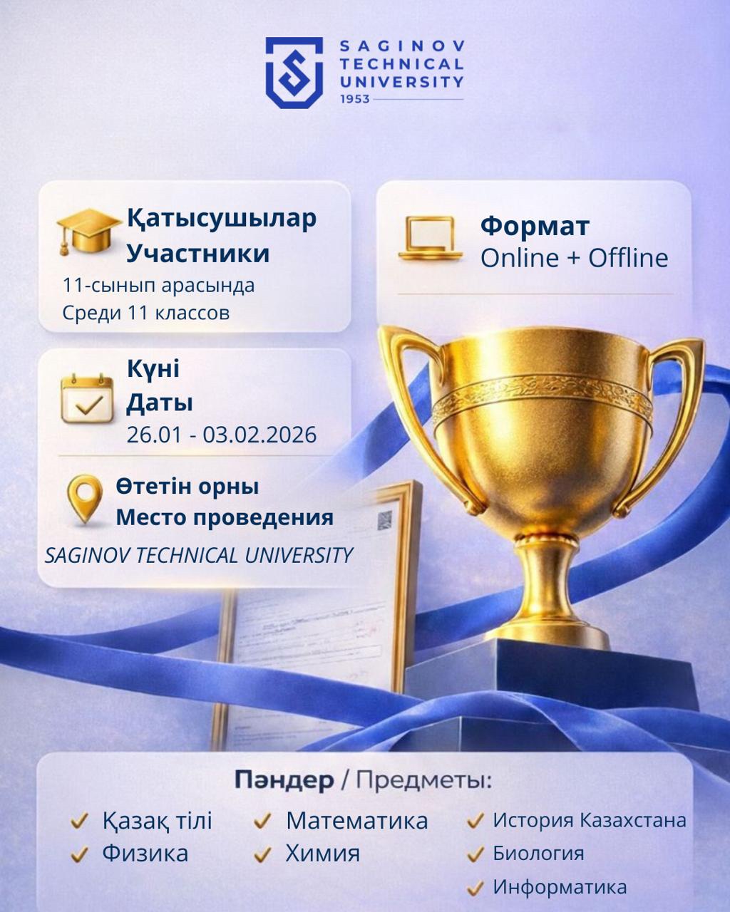 26 қаңтар – 03 ақпан аралығында Әбілқас Сағынов атындағы Қарағанды техникалық университетінде Қарағанды қаласы мен Қарағанды облысының жалпы білім беретін мектептерінің 11-сынып оқушылары арасында пәндік олимпиада өтеді.