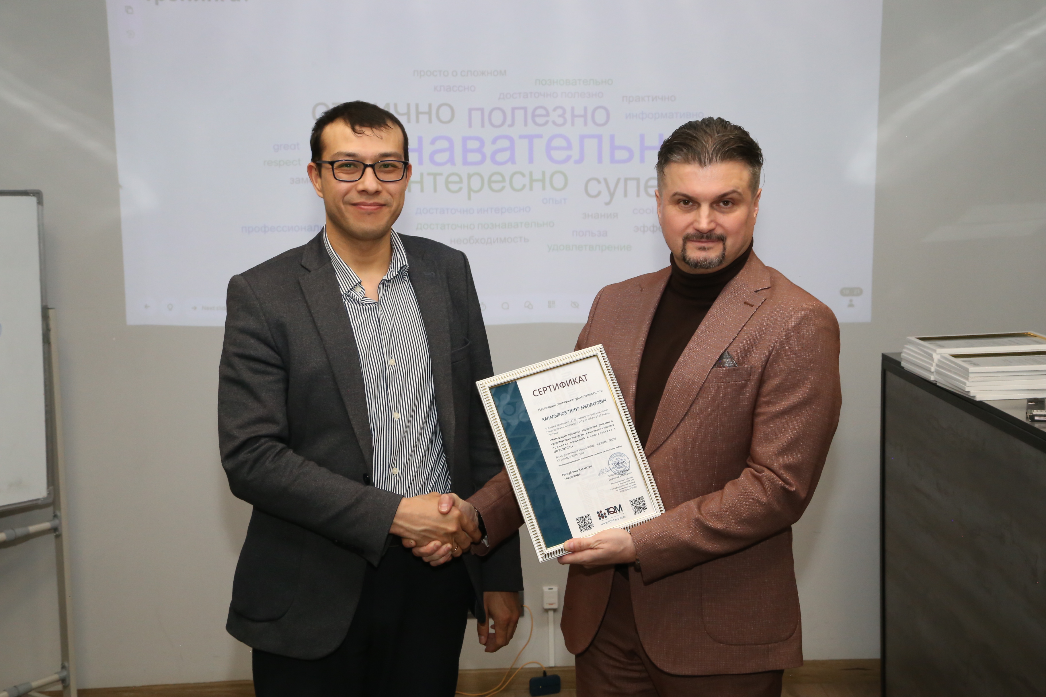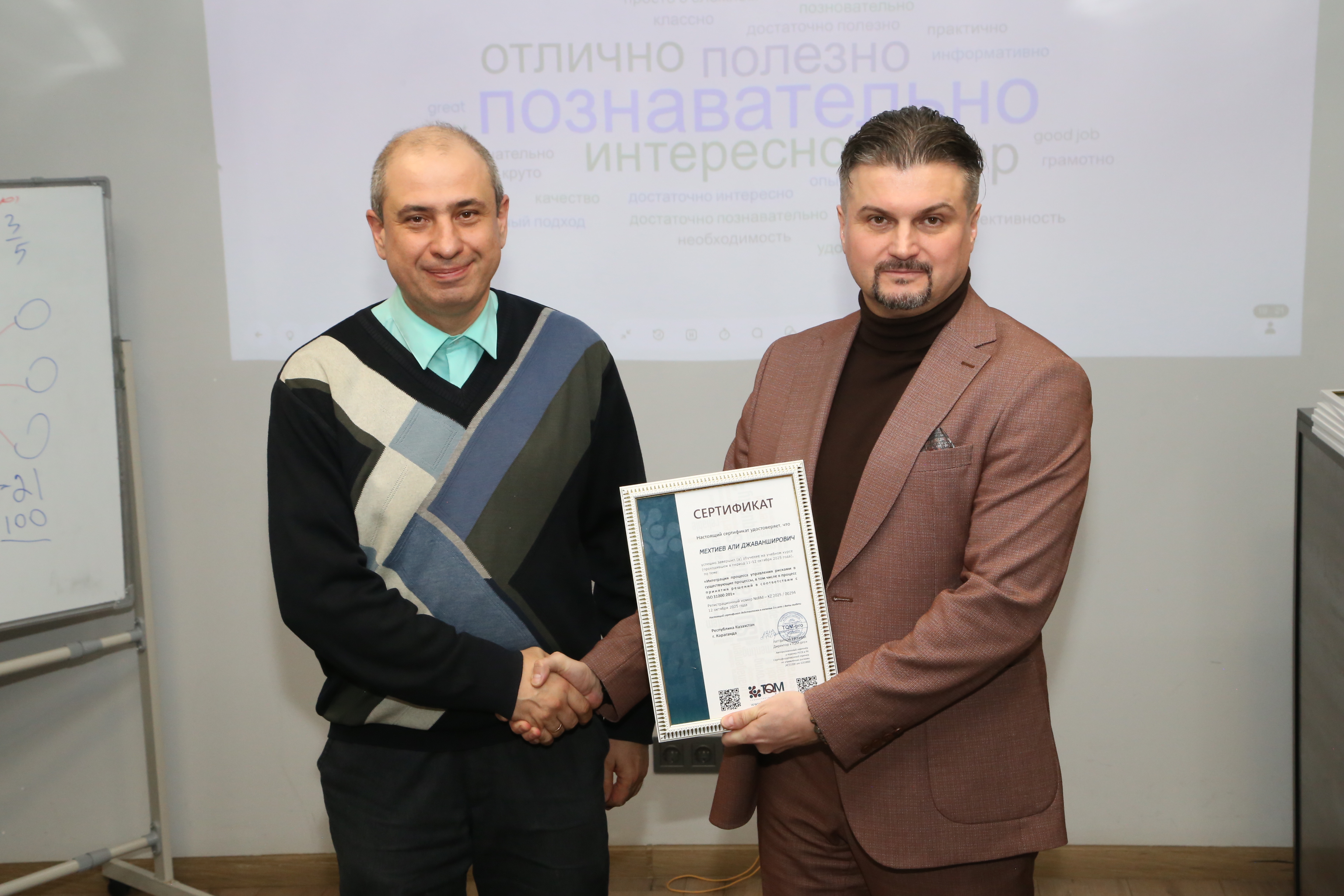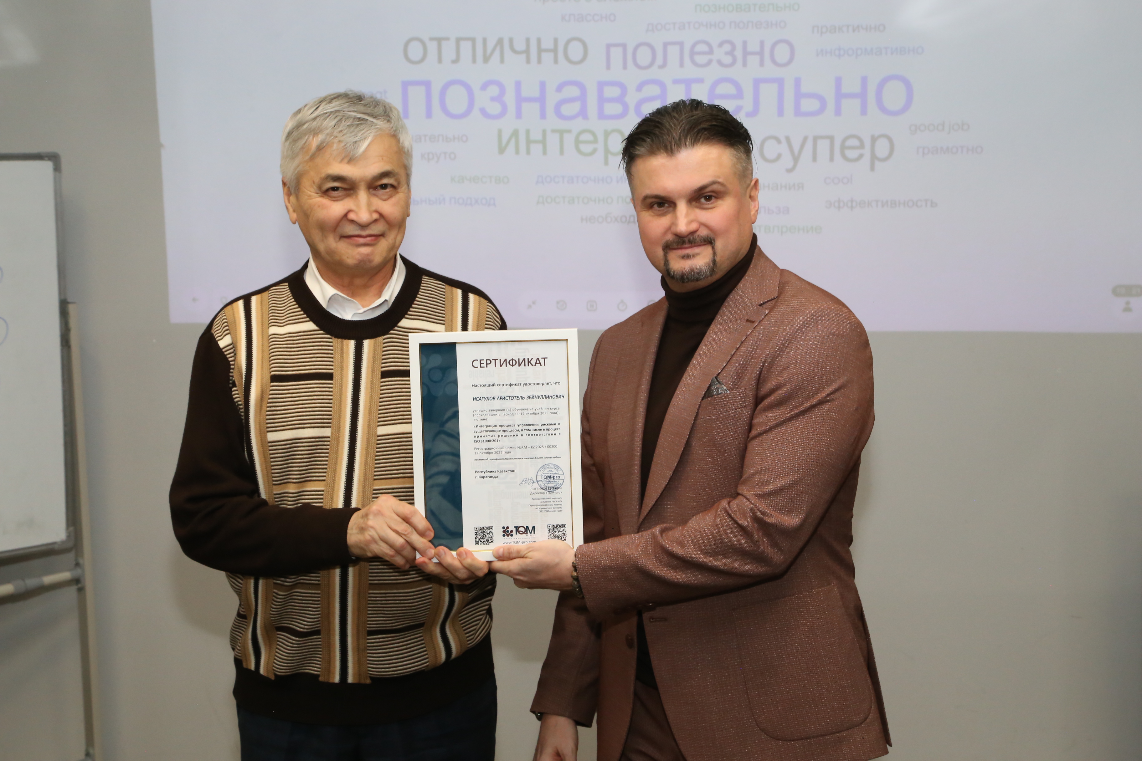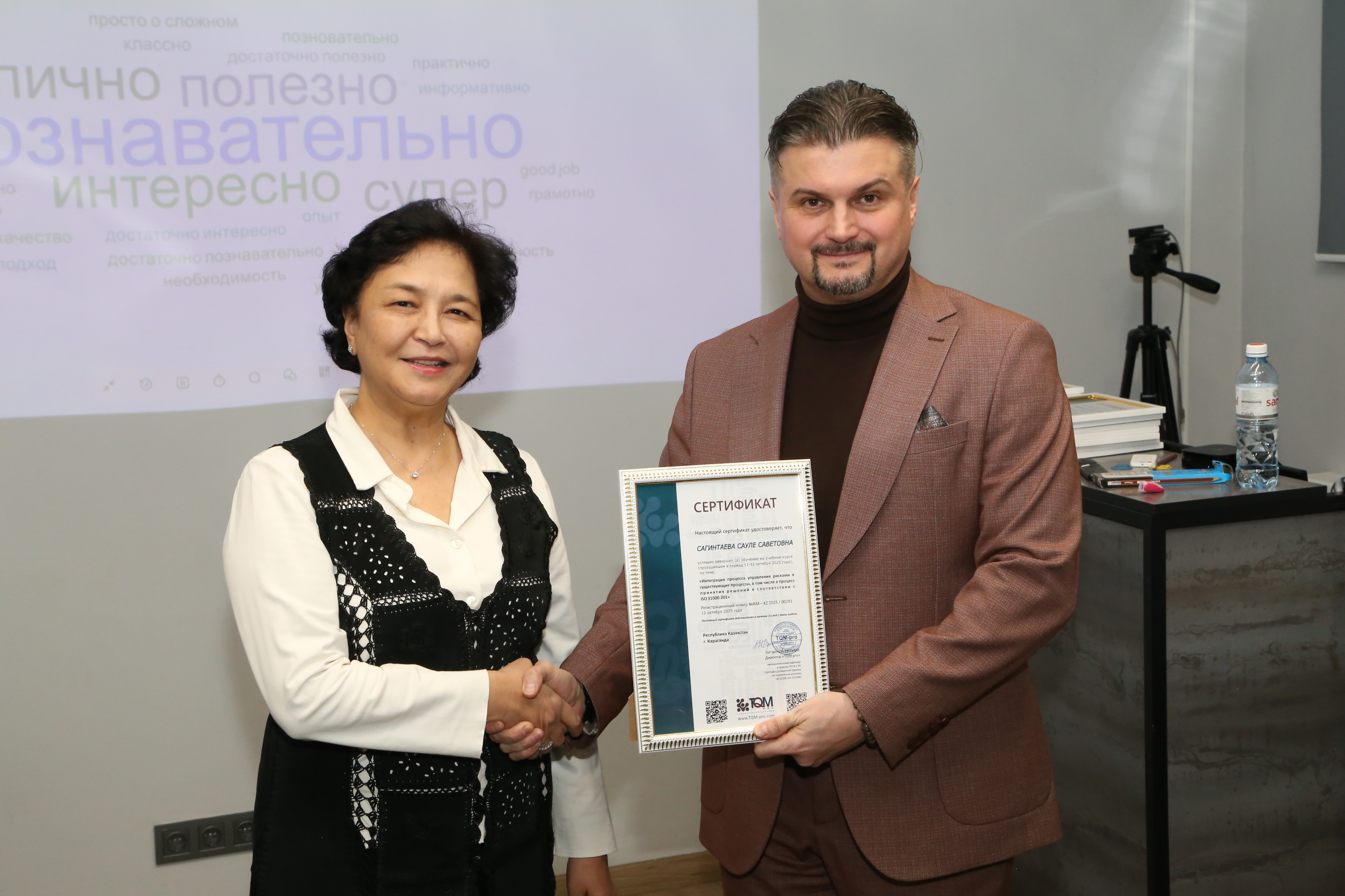 Оқу соңында қатысушыларға сертификаттар табысталды. Ұйымдастырушы – ректордың HR жөніндегі кеңесшісі Алия Орсаева. Тренингті Халықаралық «TQM-pro» компаниясының басшысы, сертификатталған эксперт Евгений Литвинов жүргізді. Компания тәуекелдерді басқару, корпоративтік қызмет және ISO стандарттарына сәйкес интеграцияланған жүйелерді енгізу саласында маманданған.