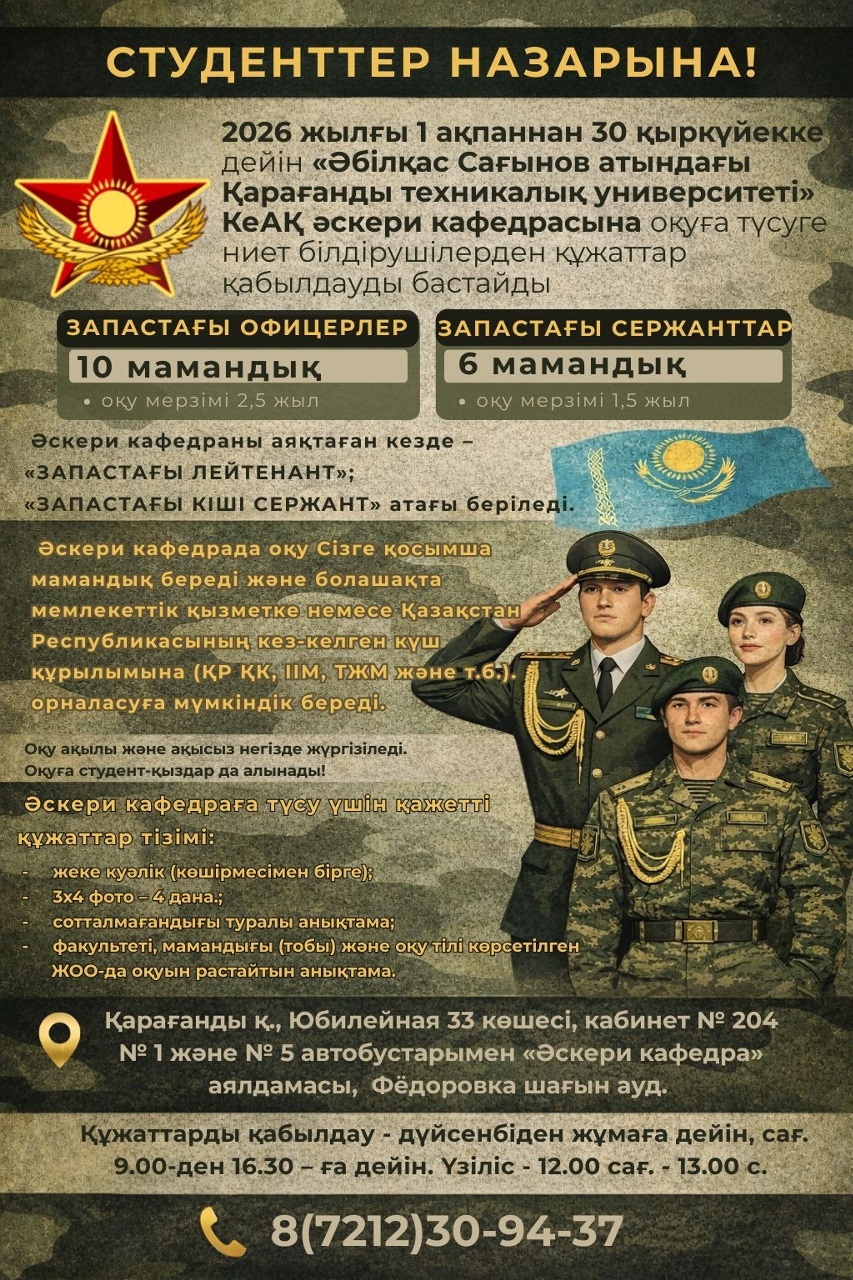 2026 жылғы 1 ақпаннан бастап КеАҚ «Әбілқас Сағынов атындағы Қарағанды техникалық университетінің» әскери кафедрасында оқуға ниет білдірушілерден құжаттар қабылдау басталады.